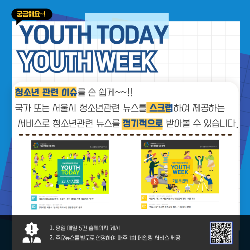서울 전역에서 운영되는 청소년시설, 프로그램, 정책·이슈 자료를 한곳에 모아, 필요한 정보를 시기와 목적에 맞게 전달하는 데 초점을 두고 있습니다.