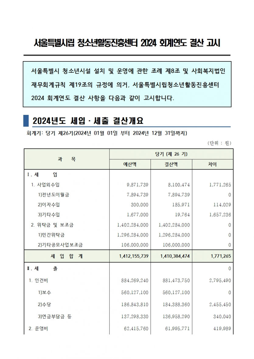 [공지] 서울특별시립청소년활동진흥센터 2024회계연도 결산 고시