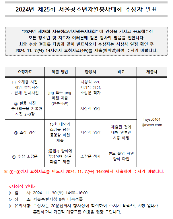 [공지] 2024년 제25회 서울청소년자원봉사대회 수상자 발표