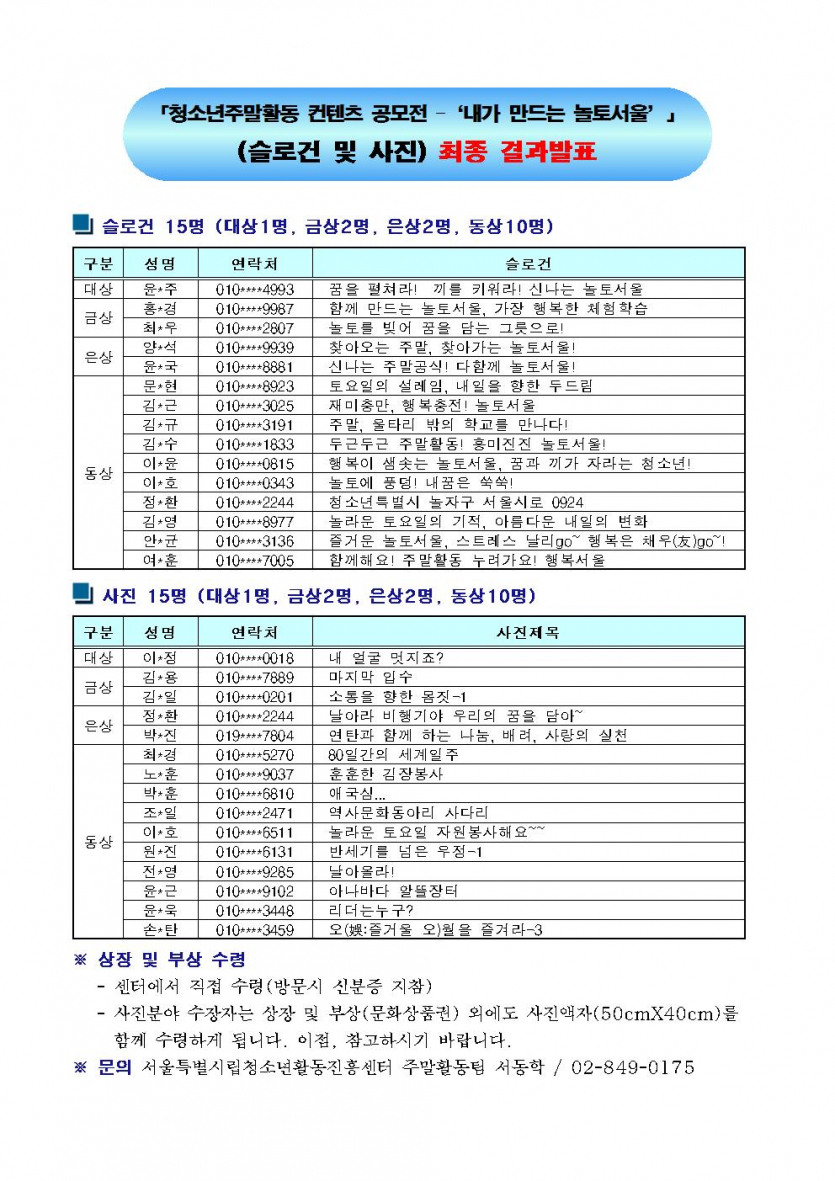 [공모전결과발표] 청소년주말활동 컨텐츠공모전 수상자 발표