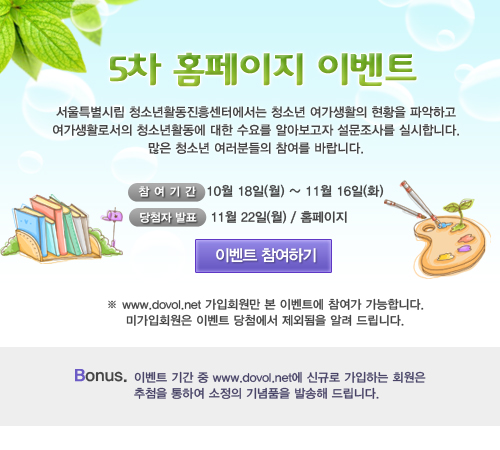 수정 삭제 목록 5차 홈페이지 이벤트 실시 페이지 정보 작성자 김충현 댓글 0건 조회 2,695회 작성일 2010-10-27 본문 이벤트 바로가기 추천0 이전글청소년활동 통신원 10월 정보왕 안내 10.11.02 다음글2010년 청소년행복장터 벼룩시장 2차 우수청소년 발표 10.10.20 댓글 0 댓글목록 등록된 댓글이 없습니다. 수정 삭제 목록