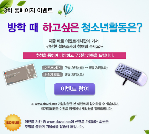 수정 삭제 목록 3차 홈페이지 이벤트 안내 페이지 정보 작성자 김충현 댓글 0건 조회 3,285회 작성일 2010-07-26 본문 간단한 설문조사에 참여하고다양한 선물 받아가세요 ^^청소년 여러분의 많은 참여바랍니다~ 유후~ 추천0 이전글같이[ː가치]공감 프로젝트 봉사활동 프로그램 협조 안내 10.07.27 다음글제1회 창의적 예술캠프 최종참가자 선정 안내 10.07.19 댓글 0 댓글목록 등록된 댓글이 없습니다. 수정 삭제 목록
