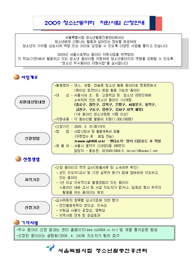 수정 삭제 목록 2009 청소년동아리 지원사업 신청 안내 페이지 정보 작성자 홍승현 댓글 0건 조회 3,518회 작성일 2009-05-14 본문 추천0 이전글국제청소년성취포상제 운영기관 모집 안내 09.05.14 다음글소외 청소년 멘토링 대학생 오리엔테이션 09.05.14 댓글 0 댓글목록 등록된 댓글이 없습니다. 수정 삭제 목록