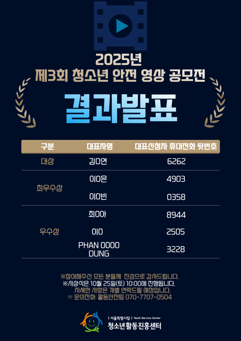 [공지] 2025년 제3회 청소년 안전 영상(shorts) 공모전 결과 안내