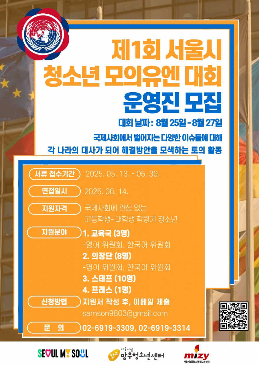 목록 [중랑구] [망우청소년센터] 제1회 서울시 청소년 모의유엔 대회 운영진 모집 페이지 정보 작성자 한창수 댓글 0건 조회 88회 작성일 2025-05-16 본문 . 이전글[한국청소년재단] 2025년 서울특별시의회 제3대 청소년시의원 모집안내 25.05.16 다음글[수원시청소년청년재단] 5월〈주제가 있는 달달한 포럼〉참석 안내 25.05.16 댓글 0 댓글목록 등록된 댓글이 없습니다. 목록
