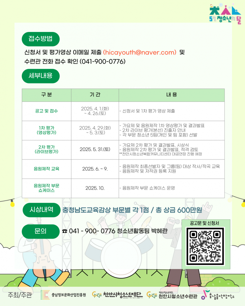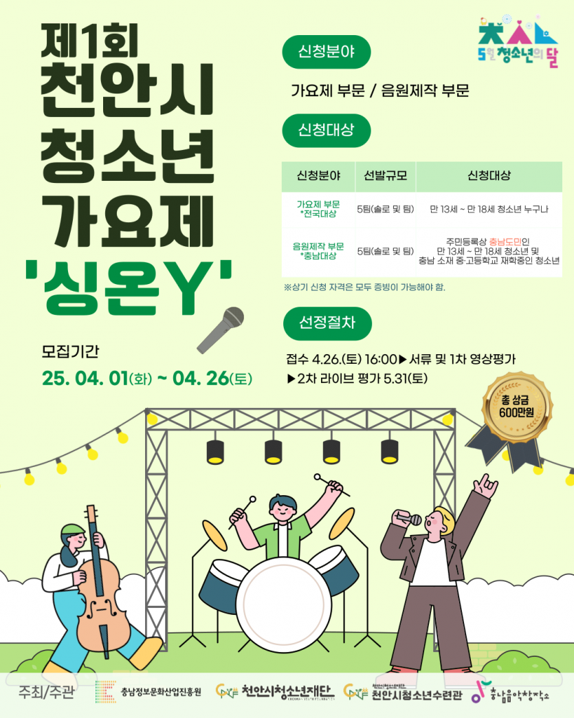 목록 [서울 외] [천안시청소년재단천안시청소년수련관] 제1회 천안시청소년가요제 싱온Y 모집안내 페이지 정보 작성자 한창수 댓글 0건 조회 82회 작성일 2025-04-11 본문 . 이전글[청소년음악센터] 2025년 청소년맞춤형 음악사업 안내 25.04.14 다음글[청소년문화교류센터] 미지동아리지원사업 세계시민동아리 모집 안내 25.04.11 댓글 0 댓글목록 등록된 댓글이 없습니다. 목록