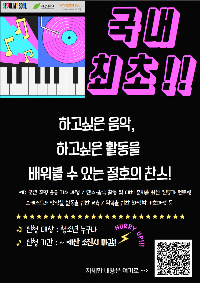 목록 [양천구] [청소년음악센터] 2025년 청소년맞춤형 음악사업 안내 페이지 정보 작성자 한창수 댓글 0건 조회 76회 작성일 2025-04-14 본문 . 이전글[보라매청소년센터] 2025년 서울국제정원박람회와 함께하는 보라매 패밀리 축제 안내 25.04.14 다음글[천안시청소년재단천안시청소년수련관] 제1회 천안시청소년가요제 싱온Y 모집안내 25.04.11 댓글 0 댓글목록 등록된 댓글이 없습니다. 목록