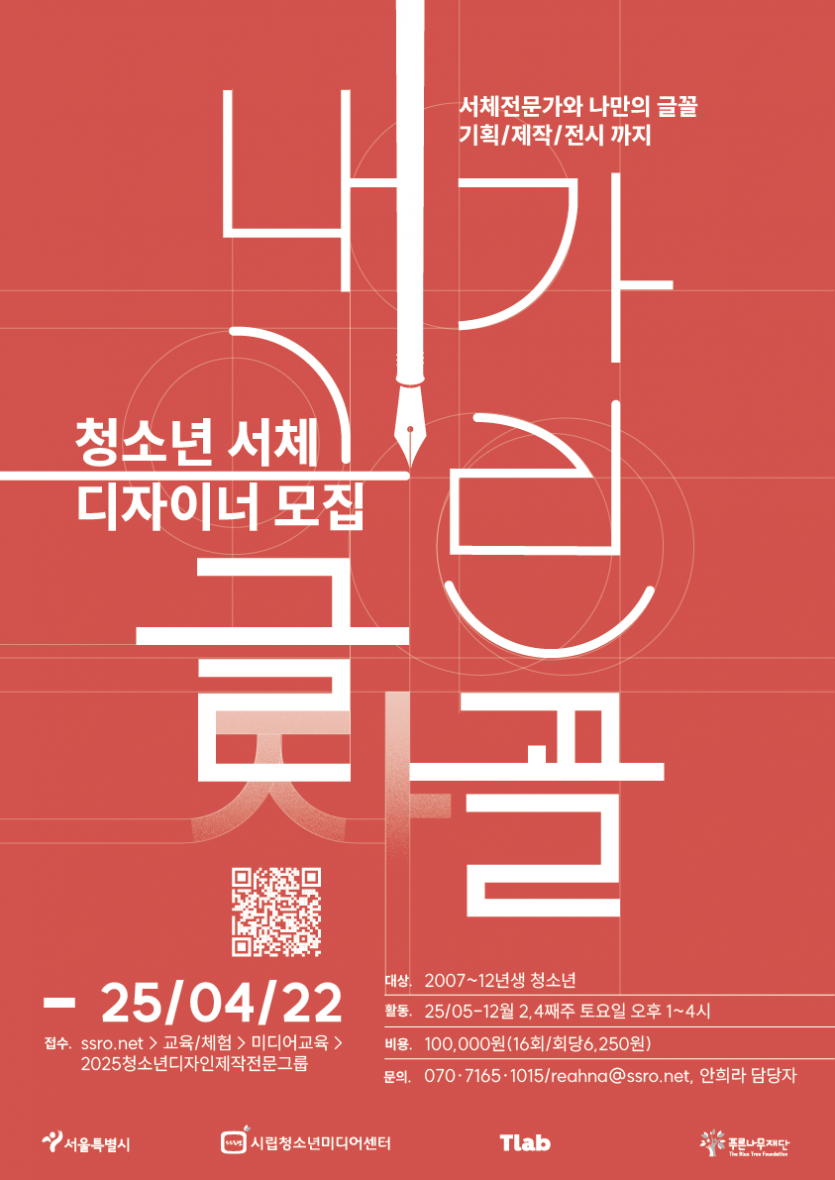 목록 [용산구] [청소년미디어센터] 2025 청소년디자인제작전문그룹 글꼴(서체/폰트) 디자인 참여자 모집 안내 페이지 정보 작성자 한창수 댓글 0건 조회 89회 작성일 2025-04-14 본문 . 이전글[국가보훈부] 광복 80주년 계기 이모티콘 굿즈 공모전 홍보 안내 25.04.15 다음글[보라매청소년센터] 2025년 서울국제정원박람회와 함께하는 보라매 패밀리 축제 안내 25.04.14 댓글 0 댓글목록 등록된 댓글이 없습니다. 목록