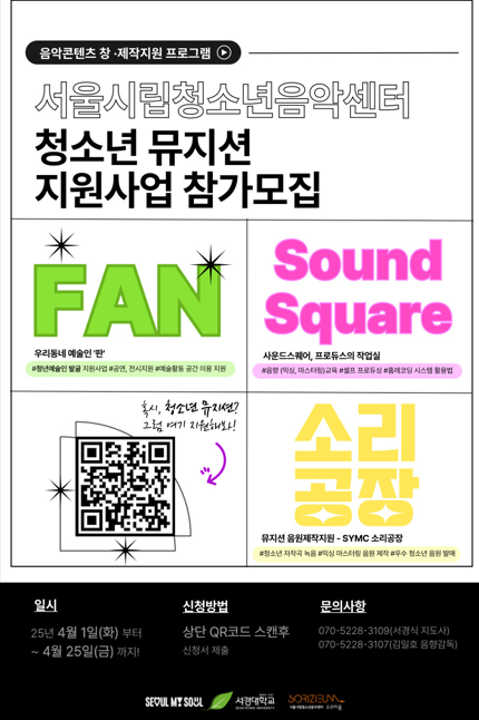목록 [양천구] [청소년음악센터] 2025년 시립청소년음악센터 청소년 예술인 지원사업 안내 페이지 정보 작성자 한창수 댓글 0건 조회 100회 작성일 2025-04-16 본문 . 이전글[노원청소년미래진로센터] 보훈 X 기술 융합 프로젝트 25.04.21 다음글[국가보훈부] 광복 80주년 계기 이모티콘 굿즈 공모전 홍보 안내 25.04.15 댓글 0 댓글목록 등록된 댓글이 없습니다. 목록