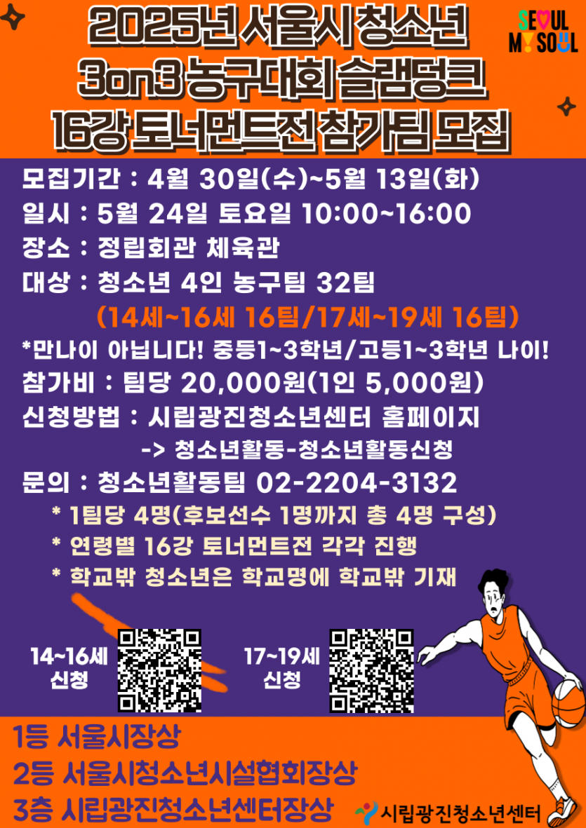 [광진구] [광진청소년센터] 2025년 서울시 청소년 3대3 농구대회 '슬램덩크' 안내