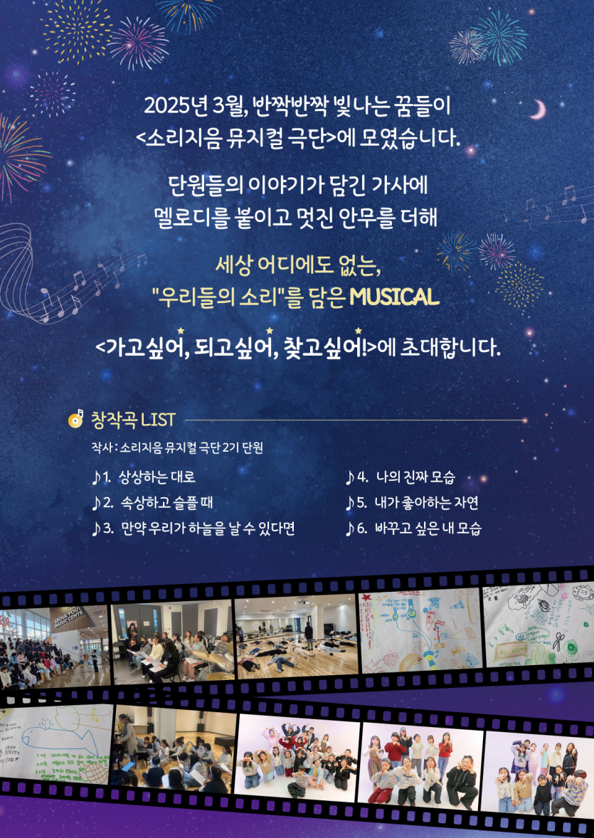 목록 [양천구] [청소년음악센터] <소리지음 뮤지컬 극단> 정기공연 안내 페이지 정보 작성자 한창수 댓글 0건 조회 147회 작성일 2025-03-04 본문 . 이전글2025년 인천 청소년 디아스포라 영상공모전 안내 25.03.06 다음글2025. 동작미래교육 만약에 프로젝트 안내 25.02.28 댓글 0 댓글목록 등록된 댓글이 없습니다. 목록