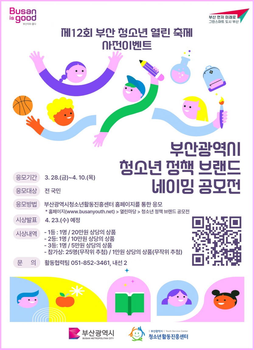목록 [공지] 제12회 부산 청소년 열린 축제 사전 이벤트 안내 페이지 정보 작성자 한창수 댓글 0건 조회 119회 작성일 2025-03-28 본문 . 이전글[장애인먼저실천운동본부] 장애인식개선을 위한 제27회 전국 유초중고등학생 백일장 개최 안내 25.04.07 다음글[환경재단] 2025 유스 그린리더 4기 장학생 모집 안내 25.03.28 댓글 0 댓글목록 등록된 댓글이 없습니다. 목록