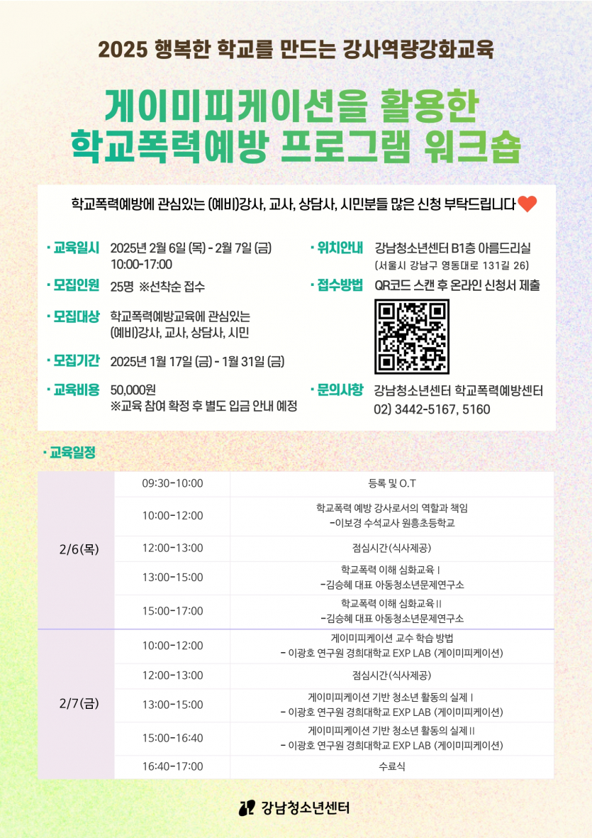 목록 [강남구] [강남청소년센터] 게이미피이션을 활용한 학교폭력예방교육 페이지 정보 작성자 한창수 댓글 0건 조회 181회 작성일 2025-01-20 본문 . 이전글[아이들과 미래재단] 아이들과미래재단 '아모레퍼시픽×무신사 MEET YOUR DREAM 캠페인' 참여 청소년 모집 25.01.24 다음글[노원미래진로센터] 스탬프 에듀투어 참가자 모집 25.01.16 댓글 0 댓글목록 등록된 댓글이 없습니다. 목록