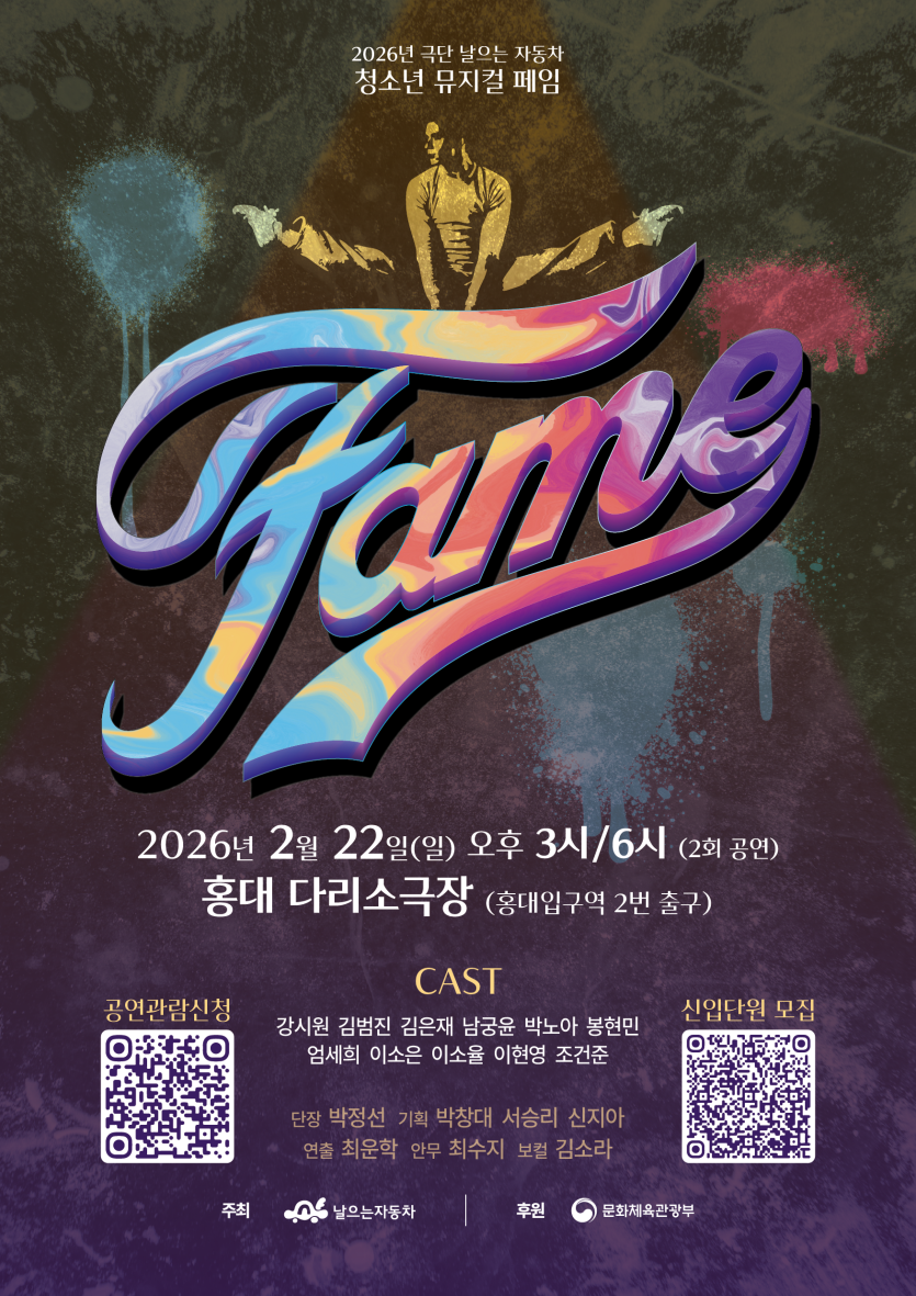 목록 [성북구] [날으는자동차] 2026년 극단 날으는 자동차 청소년 뮤지컬 페임 안내 페이지 정보 작성자 관리자 댓글 0건 조회 10회 작성일 2026-01-27 본문 . 다음글[라이나전성기재단] <바랑재 드림 키친> 참여자 모집 26.01.27 댓글 0 댓글목록 등록된 댓글이 없습니다. 목록