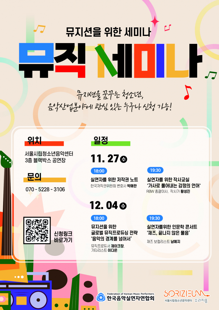 . 문 의: 사업기획부 음악사업팀 청소년지도사 김태슬(070-5228-3106)