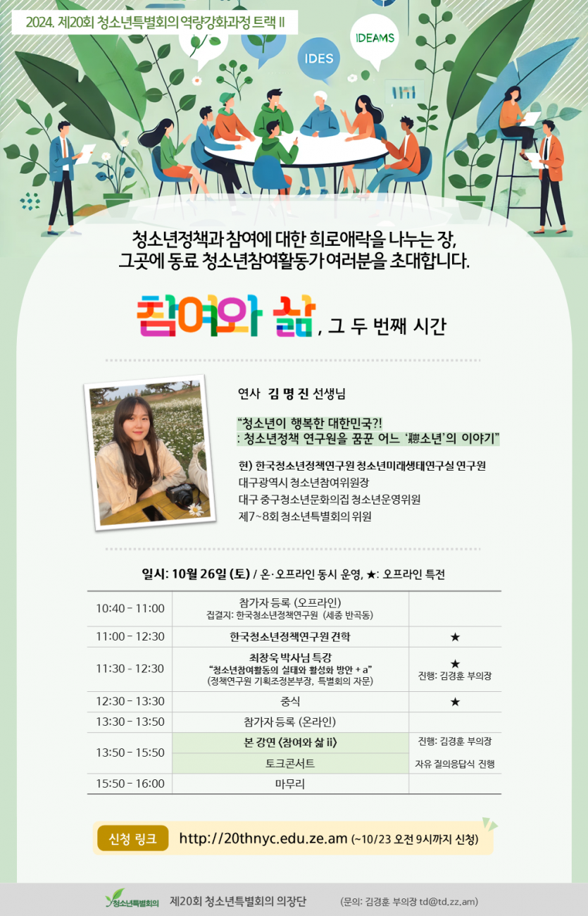 목록 [서대문구] [청소년특별회의] 참여와 삶, 그 두 번째 시간 안내 페이지 정보 작성자 한창수 댓글 0건 조회 213회 작성일 2024-10-22 본문 . 이전글[서울특별시] 2024년 청소년 참여활동 수기 공모전 "청소년 참여활동을 통한 변화와 성장" 안내 24.10.23 다음글[학교밖청소년지원센터] 2024년 찾아가는 상담 및 심리검사 참여자 모집 안내 24.10.18 댓글 0 댓글목록 등록된 댓글이 없습니다. 목록