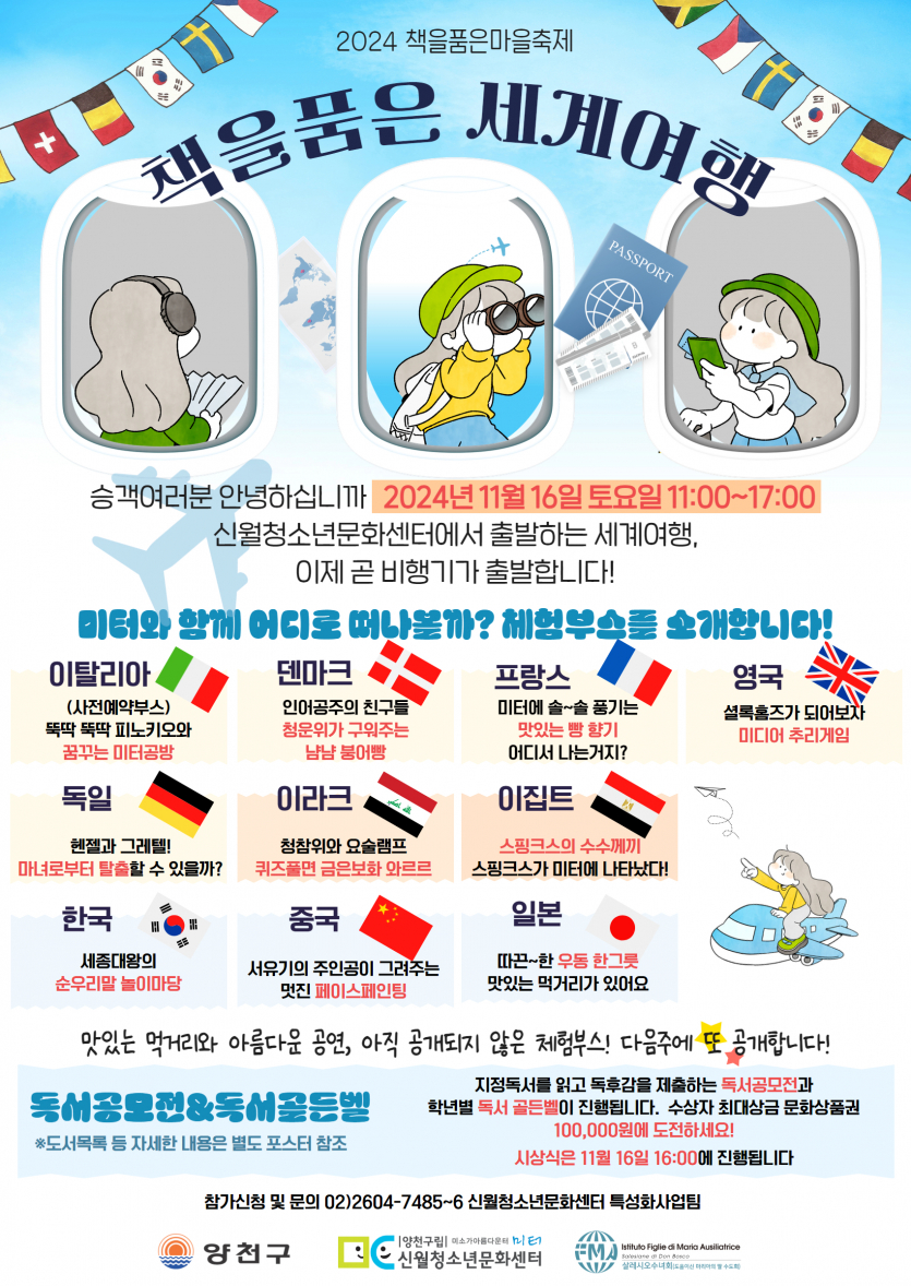 목록 [양천구] [양천구립신월청소년문화센터] 책을 품은 축제 홍보 안내 페이지 정보 작성자 한창수 댓글 0건 조회 232회 작성일 2024-11-01 본문 . 이전글[한국청소년재단] 제9회 대한민국 청소년 희망대상 안내 24.11.01 다음글[과학의전당] 제2회 미래청소년과학오디션 안내 24.10.31 댓글 0 댓글목록 등록된 댓글이 없습니다. 목록