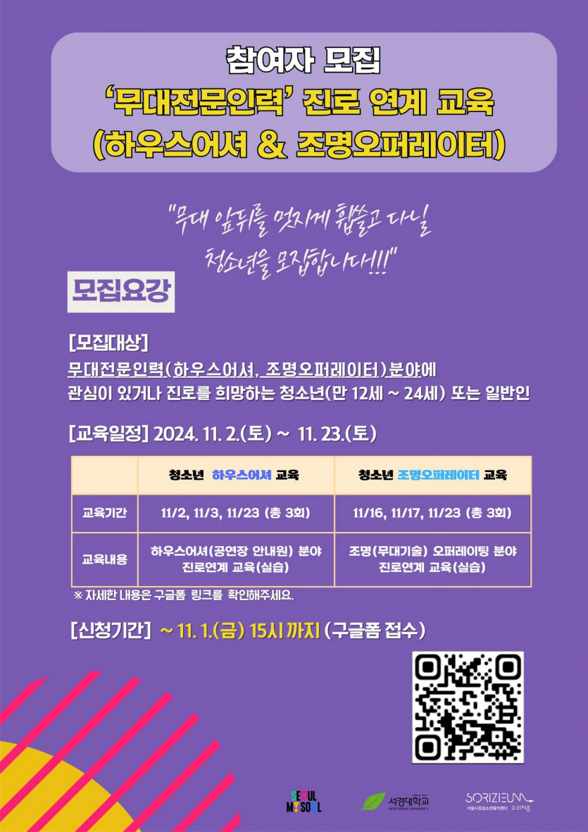 교육기간 | 2024. 11. 02.(토) 17:00 | 2024. 11. 16.(토) 10:00 | 서울시립 청소년음악센터 3F 블랙박스 공연장 |