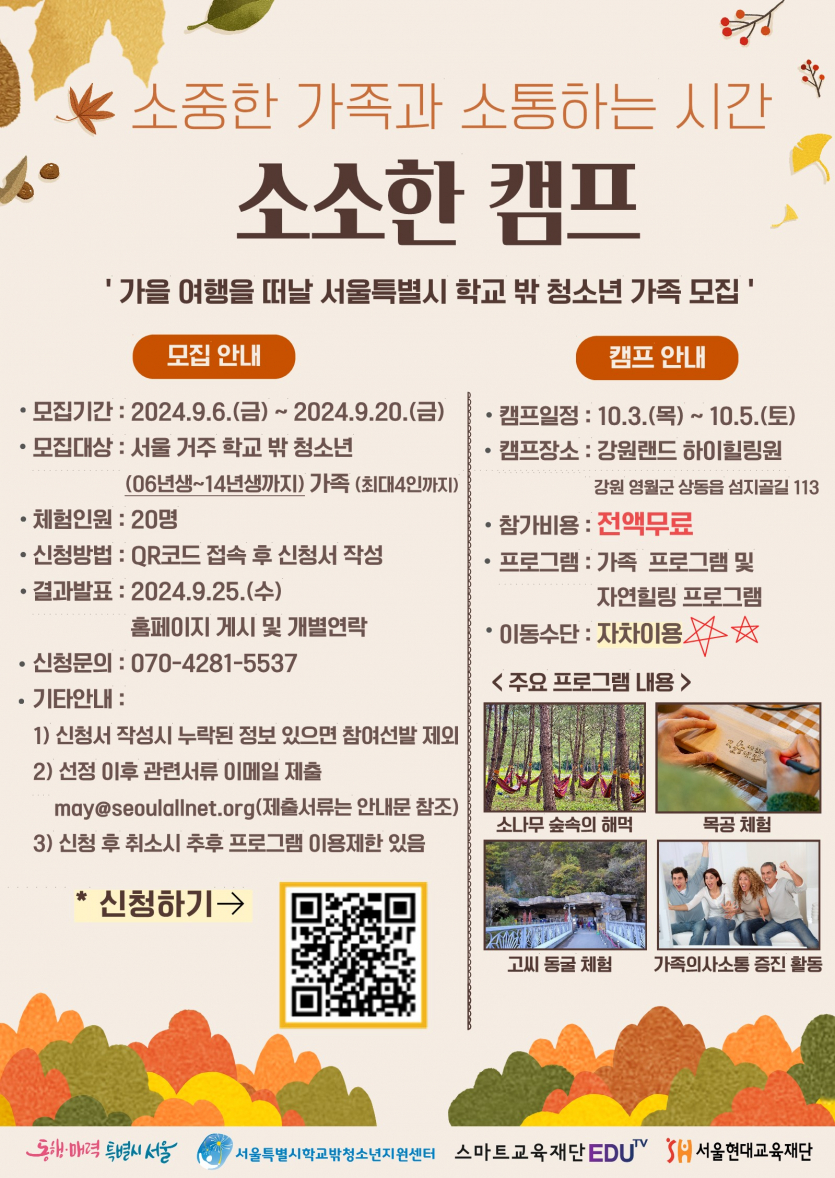 목록 [동작구] [학교밖청소년지원센터] 소중한 가족과 소통하는 시간 소소한 캠프 안내 페이지 정보 작성자 한창수 댓글 0건 조회 214회 작성일 2024-09-10 본문 . 이전글[서울특별시] 2024년 청소년 대상 마약류 예방교육극 뮤지컬 공연 안내 24.09.11 다음글[문래청소년센터] 2024년 청소년 프리마켓 '달촌 야시장의 가을(Autumn)' 청소년 셀러 모집 안내 24.09.10 댓글 0 댓글목록 등록된 댓글이 없습니다. 목록