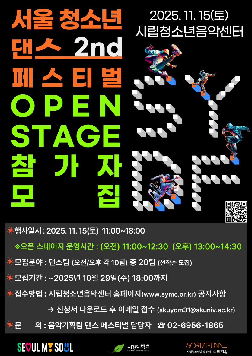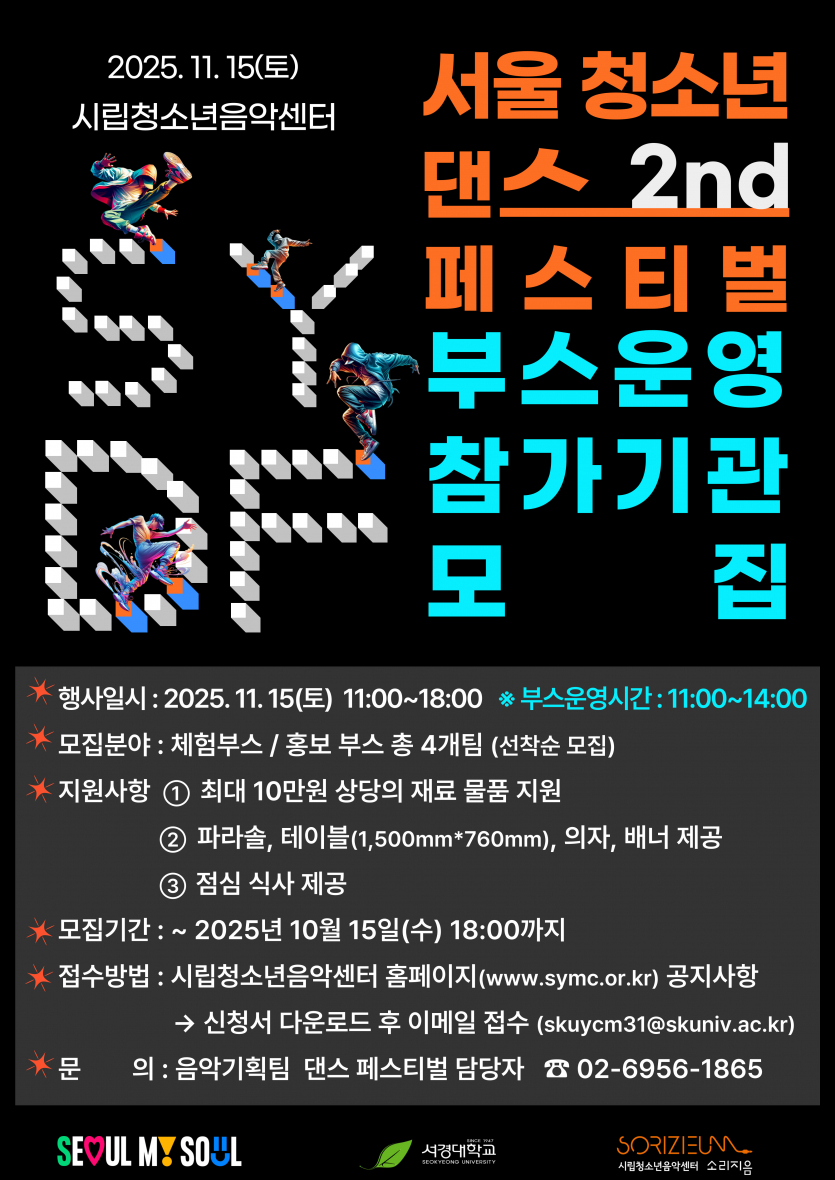 - 다음글[청소년음악센터] SYDF 서울 청소년 댄스 페스티벌 댄스경연대회 참가팀 모집안내 25.09.22
