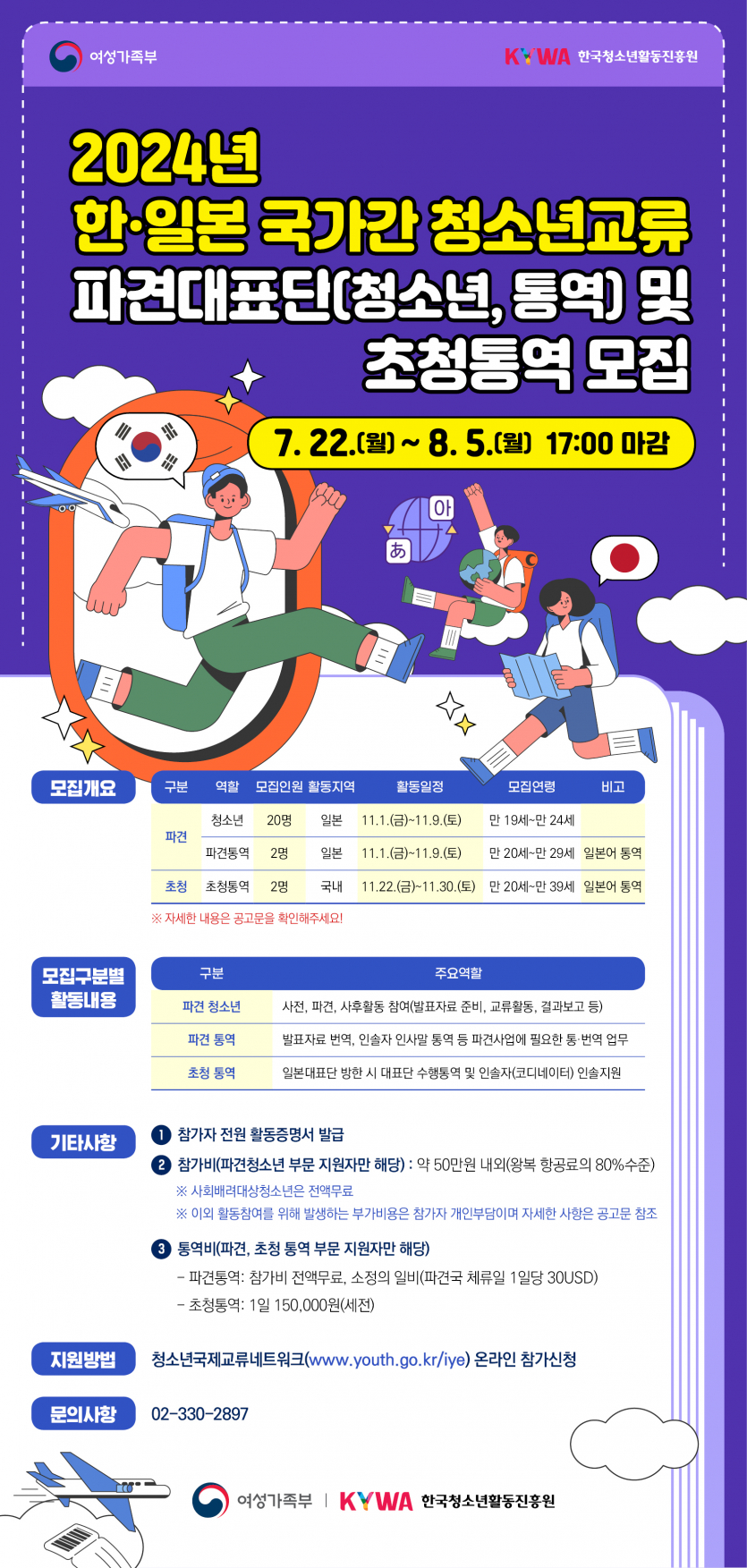 [서대문구] [한국청소년활동진흥원] 2024년 한일국가간 청소년교류 파견대표단(청소년, 통역) 및 초청수행통역 모집 안내