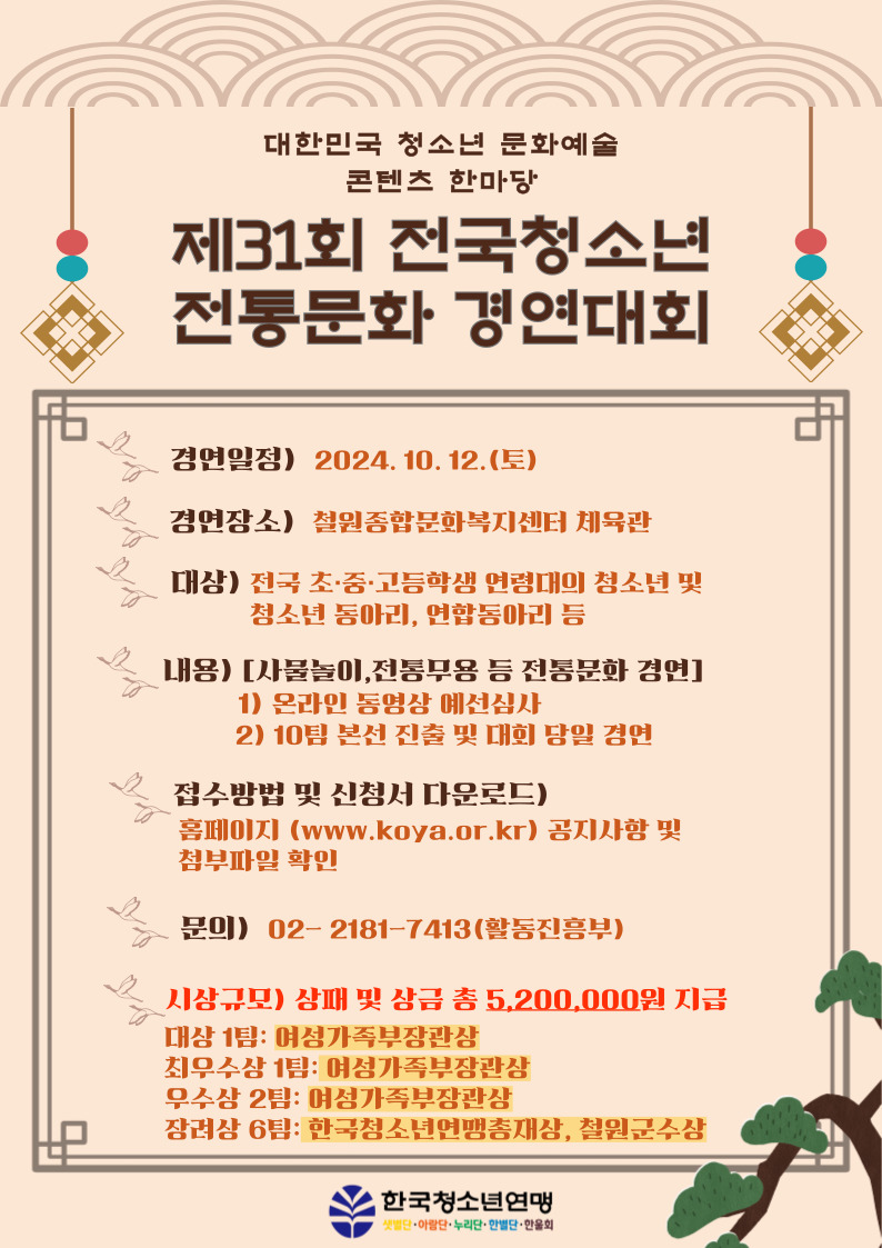목록 [동작구] 제31회 전국청소년 전통문화 경연대회 인내 페이지 정보 작성자 관리자 댓글 0건 조회 231회 작성일 2024-06-07 본문 제31회 전국청소년 전통문화 경연대회 인내 이전글YES 프로젝트 공모전 참여 청소년 모집 24.06.10 다음글2024년 청소년 생명존중 지도자 양성과정 연수 홍보 24.06.07 댓글 0 댓글목록 등록된 댓글이 없습니다. 목록