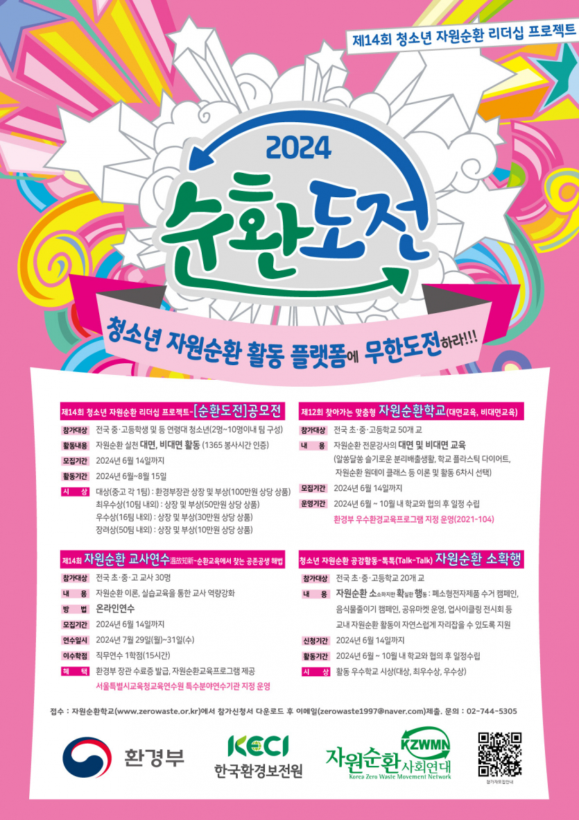 * 자세한 내용은 자원순환학교 홈페이지(http://www.zerowaste.or.kr) 또는 첨부파일 "제14회 청소년 자원순환 리더십 프로젝트-[순환도전] 안내문" 참조