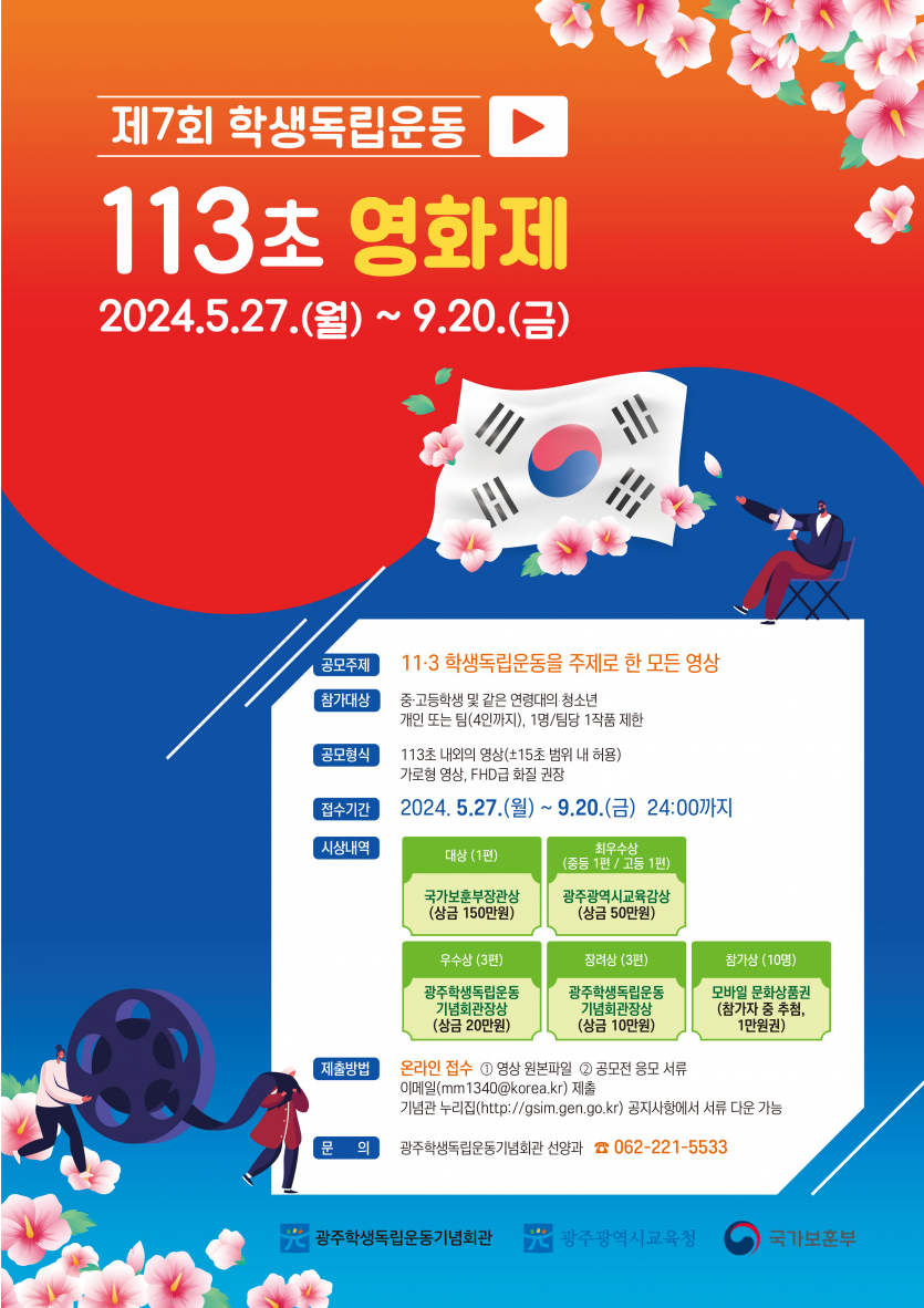 가. 기 간 : 2024. 5. 27.(월) ~ 9. 20.(금) 나. 대 상 : 중·고등학생 및 같은 연령대의 청소년, 개인(팀) 다. 공모내용 : 11·3 학생독립운동 관련 제작 영상 라. 접수방법 : 온라인 접수 마. 시상내역