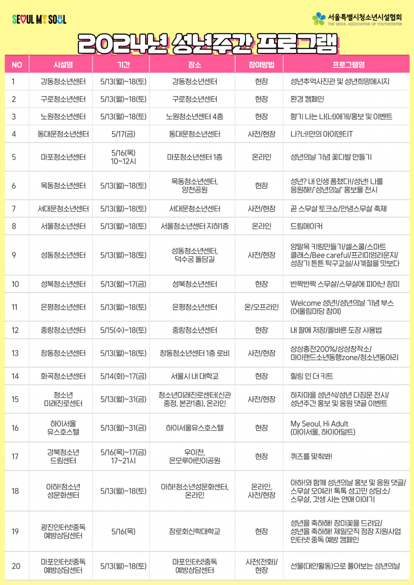 1 | 청소년시설 성년주간 프로그램 | 2024. 5. 13.(월) ~ 5. 18.(토) | 각 청소년시설 (※붙임 참고) | 성년 대상자 (19세, 2005년생), 청소년, 서울시민 | 프로그램 및 이벤트 운영 |