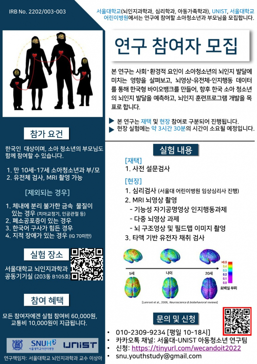 본 연구팀은 "소아청소년기 경험과 정신적 스트레스에 따른 뇌인지 바이오 뱅크 기반 발달 궤적 연구"를 위한 MRI 실험, 유전체, 인지 행동, 심리 및 환경 관련 설문조사에 참여할 만 10세~17세 청소년을 모집하고 있습니다 (서울대학교 IRB No. 2202/003-003).
