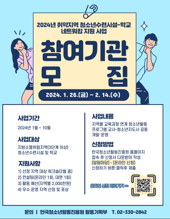 [홍보] 2024년 취약지역 청소년수련시설-학교 네트워킹 지원사업 참여기관 모집