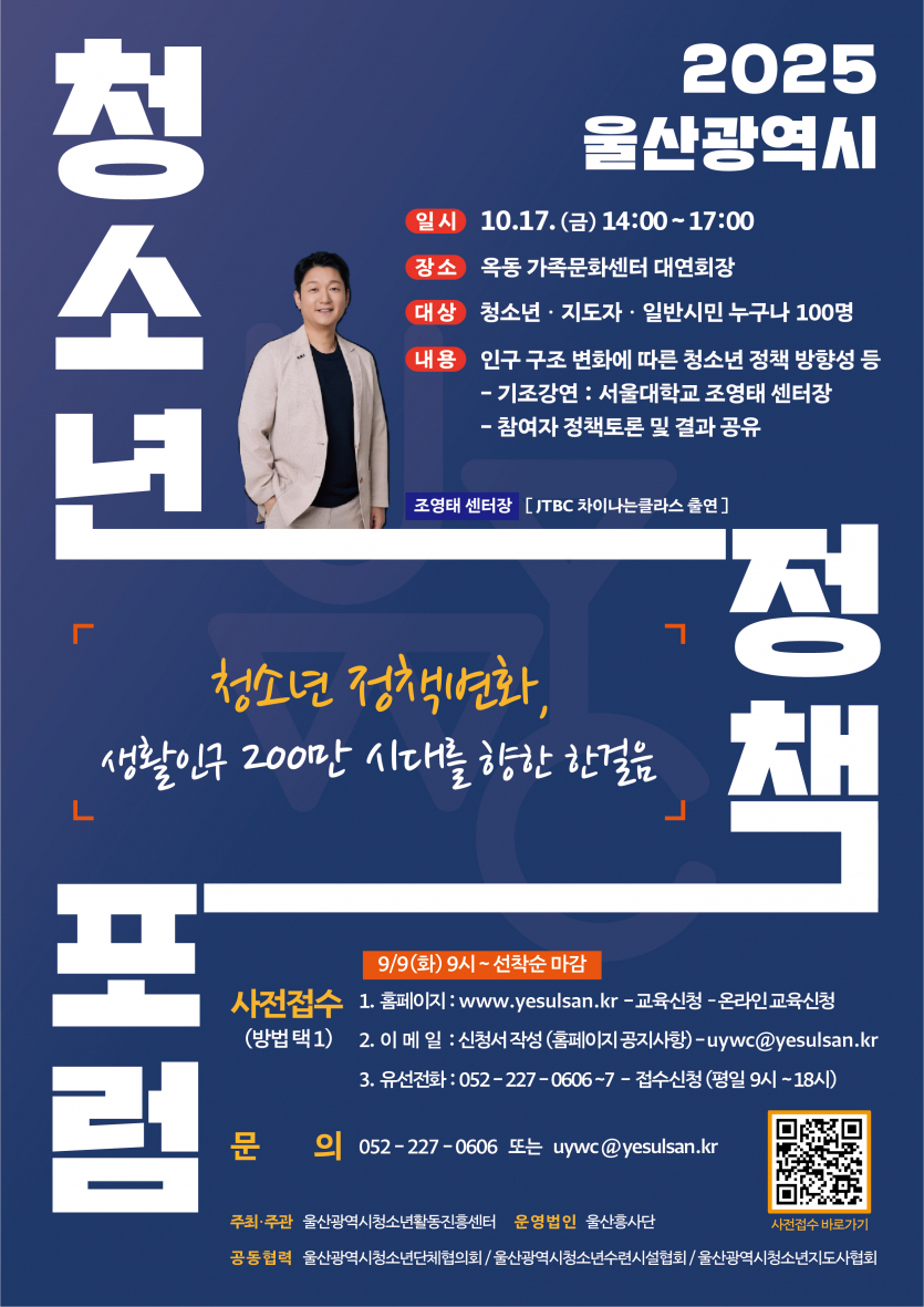 [서울 외] [울산광역시청소년할동진흥센터]「2025년 울산광역시 청소년정책 포럼(기조강연: 서울대학교 조영태 교수)」사전접수 안내