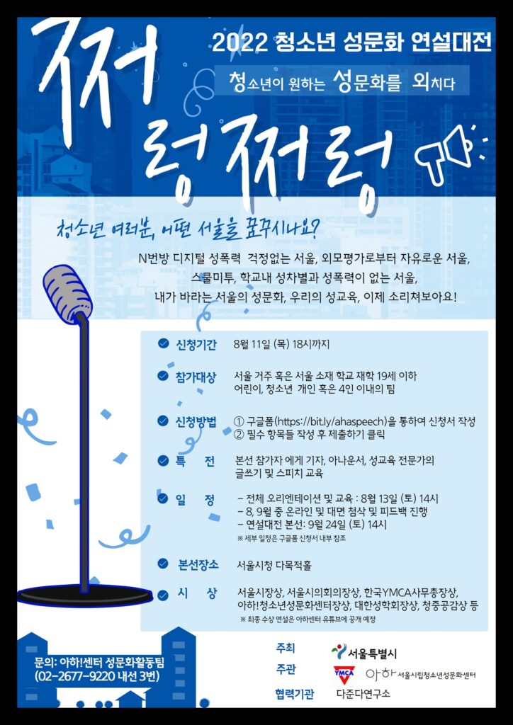 수정 삭제 목록 [청소년 성문화 연설대전 '쩌렁쩌렁'] 참여자 모집 페이지 정보 작성자 서울시립아하청소년성문화센터 댓글 0건 조회 1,580회 작성일 2022-08-05 본문 ○ 접수방법- 구글폼 ( https://bit.ly/ahaspeech )을 통한 신청 이전글[모집] 청소년 진로탐색 프로그램 '내일드림 #스타트업편' 8월 22.08.05 다음글[MnJ문화복지재단] 제5회 꿈사진 꿈영상 공모전 22.07.29 댓글 0 댓글목록 등록된 댓글이 없습니다. 수정 삭제 목록
