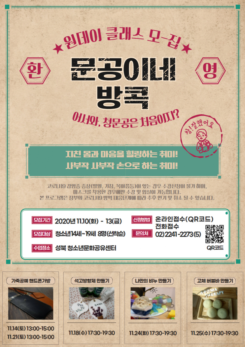 [청소년문화공유센터]11월 원데이클래스[문공이네 방콕] 참여자를 모집합니다(~11.13까지)