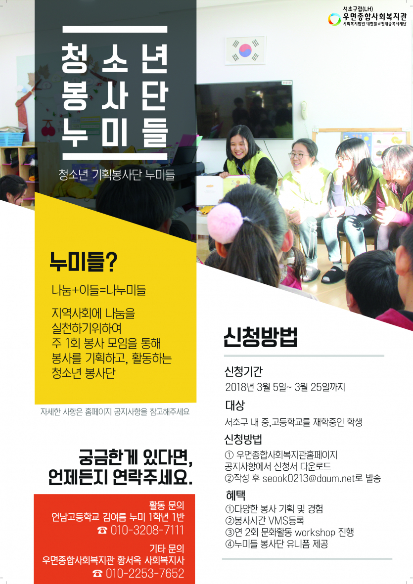 수정 삭제 목록 [우면종합사회복지관]청소년 기획봉사단 누미들 2기모집 페이지 정보 작성자 우면종합사회복지관 댓글 0건 조회 3,071회 작성일 2018-03-09 본문 자세한 사항은 http://www.woomyun.or.kr/bbs/board.php?bo_table=m71&wr_id=1039 를 참고해주시기 바랍니다. 이전글서울YMCA 기획봉사동아리 S.O.S(Safety of seoul) 청소년 자원봉사자 모집 18.03.13 다음글2018 국립극단 어린이청소년극연구소 청소년17인 및 협력학교 모집 18.02.27 댓글 0 댓글목록 등록된 댓글이 없습니다. 수정 삭제 목록