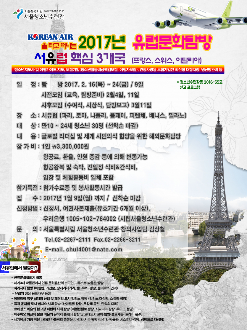 서울특별시립 서울청소년수련관에서는 청소년들의 글로벌 리더십과 세계시민의식 함양을 목적으로 2017년 청소년 유럽문화탐방(서유럽 핵심3개국 - 프랑스, 스위스, 이탈리아) 프로그램을 진행합니다. 아래의 내용을 참조하시어 참가를 희망하는 청소년 여러분들의 많은 관심과 참여 바랍니다.