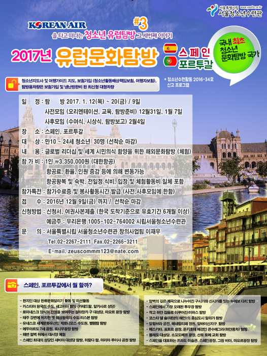 서울특별시립 서울청소년수련관에서는 청소년들의 글로벌 리더십과 세계시민의식 함양을 목적으로 2017년 청소년 유럽문화탐방(스페인,포르투갈) 프로그램을 진행합니다. 아래의 내용을 참조하시어 참가를 희망하는 청소년 여러분들의 많은 관심과 참여 바랍니다.