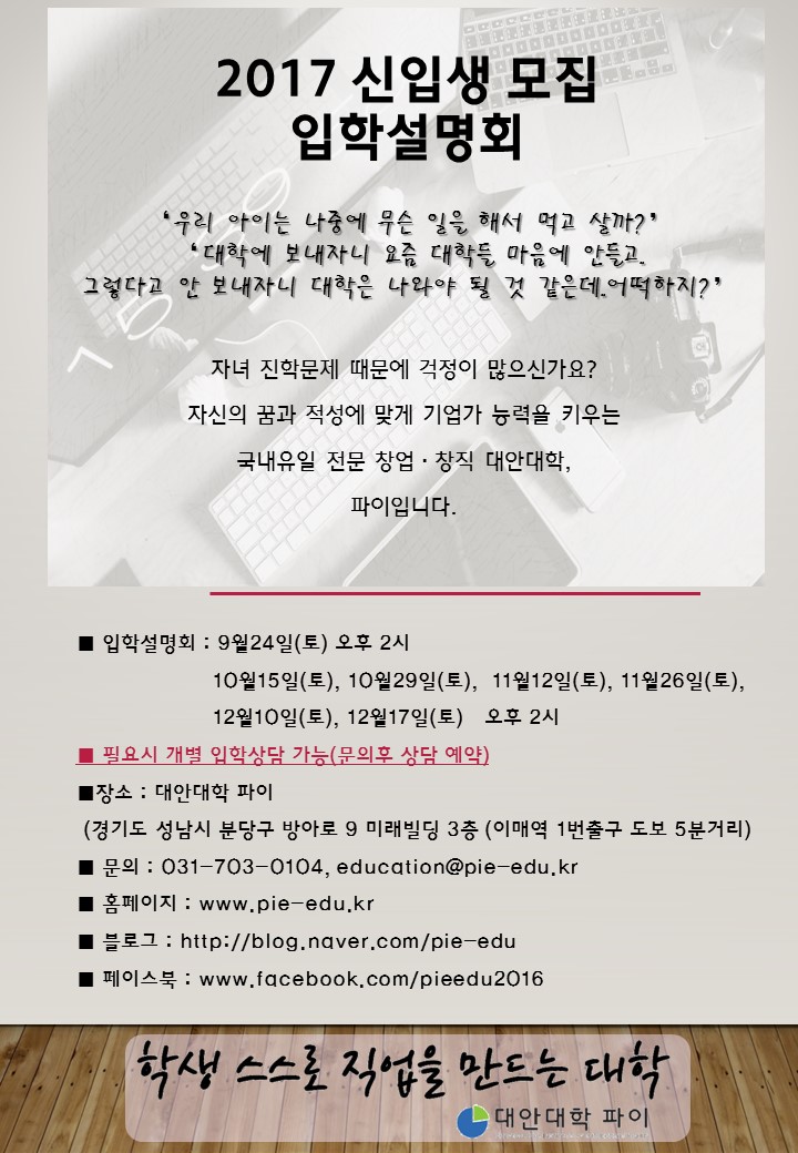 대안대학 파이는 오는 9월24일 토요일 오후 2시부터 학교에서 입학 설명회를 개최합니다.