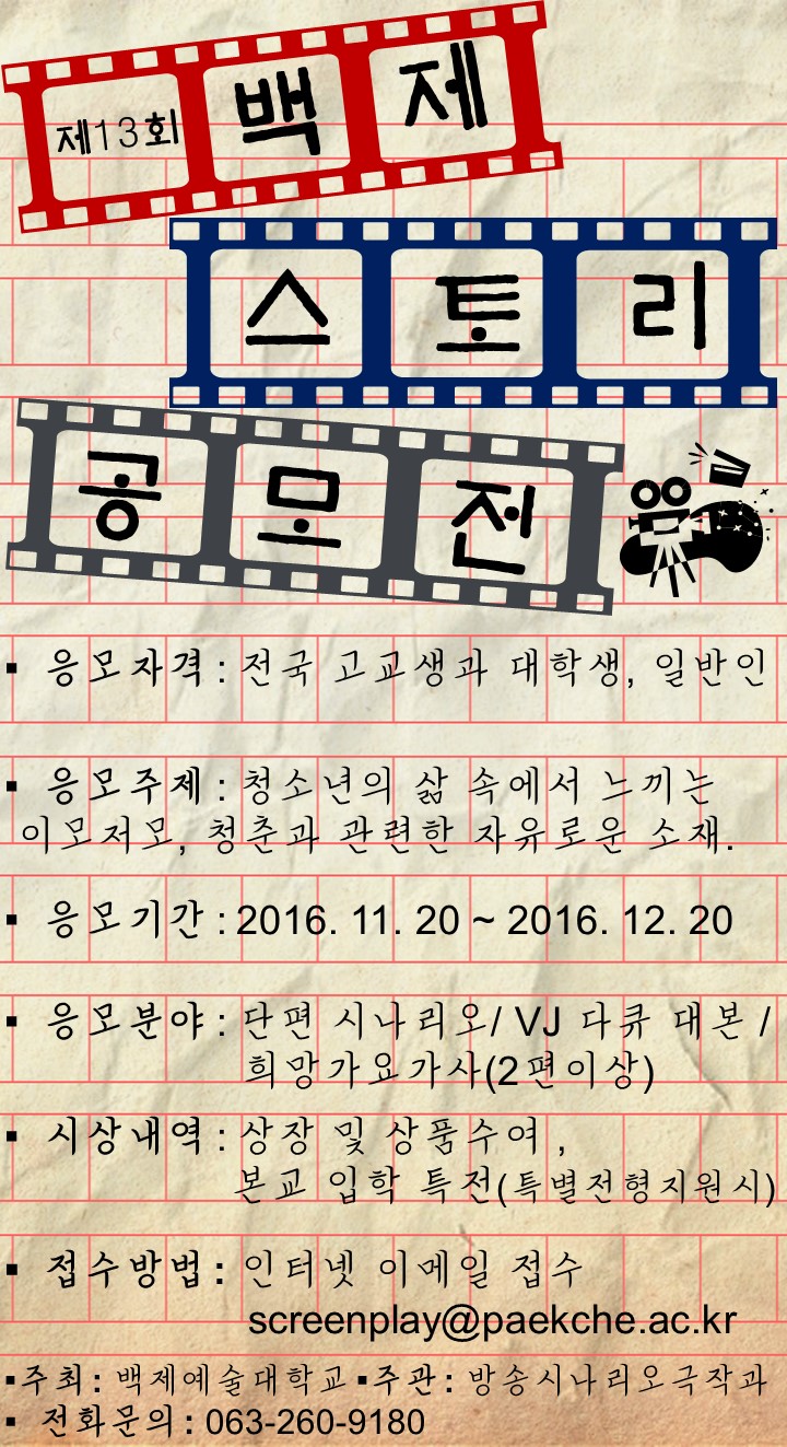 백제예술대학교 “방송시나리오극작과”에서는 전국 고교생과 대학생, 일반인 대상으로 단편영화 시나리오, VJ 다큐대본, 희망가요가사를 아래와 같이 널리 공모하오니, 희망찬 젊은 열정을 지닌 청소년▪청년▪일반인들의 많은 참여 기대합니다.