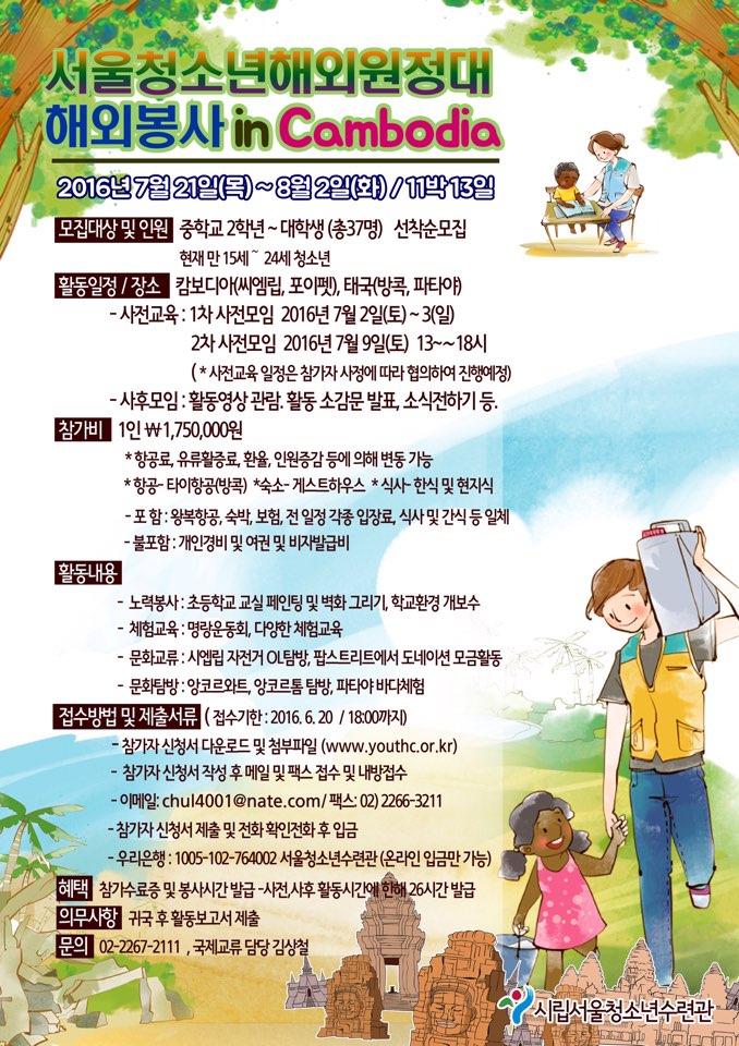 서울특별시립 서울청소년수련관에서는 청소년들의 글로벌 리더십과 세계시민의식 함양을 목적으로 2016년 하계 서울청소년해외원정대 (해외봉사 in Cambodia) 프로젝트 사업을 진행합니다. 아래 내용을 참조하시어 참가를 희망하는 청소년 여러분들의 많은 관심과 참여 바랍니다.