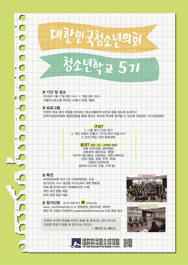 - 뚜렷한 목표를 없이 대입을 준비하는 청소년들에게 비전과 꿈을 찾도록 도와주고 입학사정관(학생부 종합전형)을 통해 원하는 학교와 학과에 합격할 수있도록 코칭하는 대한민국청소년의회의 '자기성장캠프'입니다.