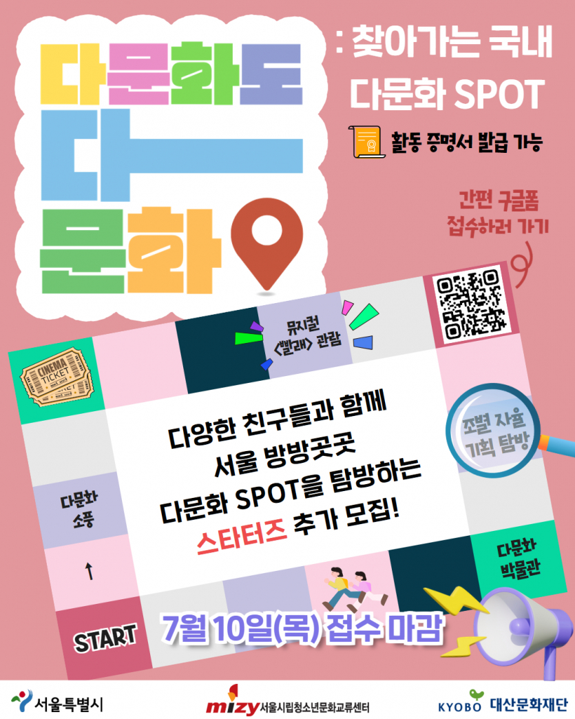 목록 [중구] [미지센터] "다문화도 다 문화" 참가자 모집 안내 페이지 정보 작성자 한창수 댓글 0건 조회 37회 작성일 2025-07-02 본문 . 이전글[궁동청소년문화의집] "제1회 구로 청소년 e스포츠 슈퍼컵" 대회 홍보 안내 25.07.04 다음글[한국청소년연맹] 자유평화통일 한반도의 미래 주니어 워크숍 안내 25.07.01 댓글 0 댓글목록 등록된 댓글이 없습니다. 목록