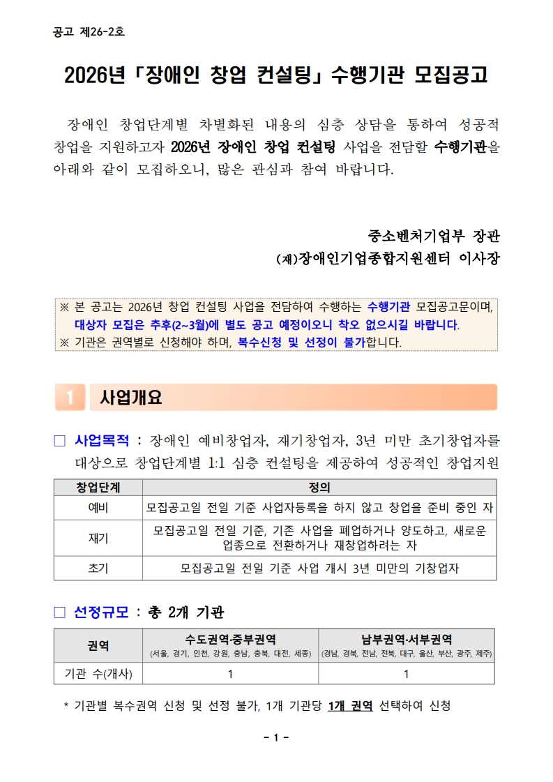 . 공 고 명: 2026년 장애인 창업 컨설팅 수행기관 모집공고