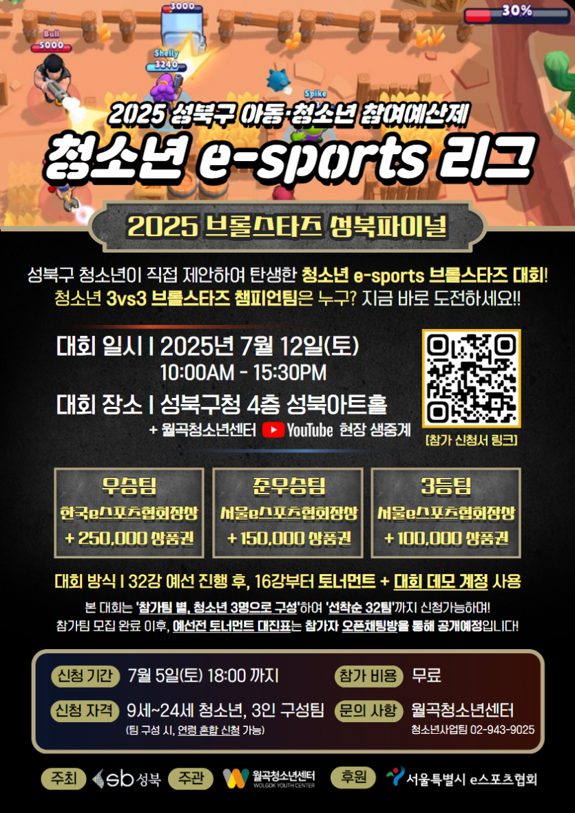 목록 [성북구] [월곡청소년센터] 2025년 청소년 E-스포츠 대회 '브롤스타즈 성북파이널' 대회 안내 및 참가팀 모집 안내 페이지 정보 작성자 한창수 댓글 0건 조회 179회 작성일 2025-05-28 본문 . 이전글[문래청소년센터] 2025년 청소년 프리마켓 '달촌 야시장의 여름' 청소년 셀러 모집안내 25.05.30 다음글[청소년음악센터] 2025년 <청소년 작사 워크숍> 참여 청소년 모집 안내 25.05.28 댓글 0 댓글목록 등록된 댓글이 없습니다. 목록