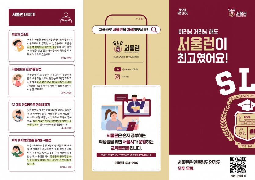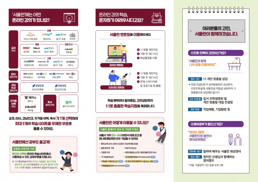 ’24.10.1.(화), 서울형 교육플랫폼 ‘서울런(Seoul Learn)’이 서비스 신청자격을 기존보다 확대하여 서울런 학습콘텐츠 이용 수요가 있는 아동·청소년을 폭넓게 지원합니다. 신규 추가된 서울런 지원 대상이 궁금하신 분들은 지금 바로 ‘서울런’을 방문해 보세요. (※ 홈페이지 https://slearn.seoul.go.kr)