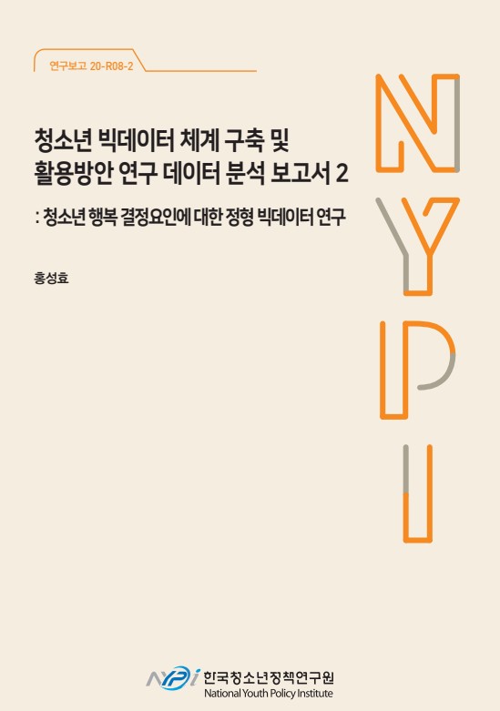 "본 저작물은 '한국청소년정책연구원'에서 '2020년' 작성하여 공공누리 제4유형으로 개방한 청소년 빅데이터 체계 구축 및 활용방안 연구 데이터 분석 보고서2-청소년 행복 결정요인에 대한 정형 빅데이터 연구 (작성자:홍성효)'을 이용하였으며, 해당 저작물은 '한국청소년정책연구원,https://www.nypi.re.kr/contents/mainpage.do'에서 무료로 다운받으실 수 있습니다."