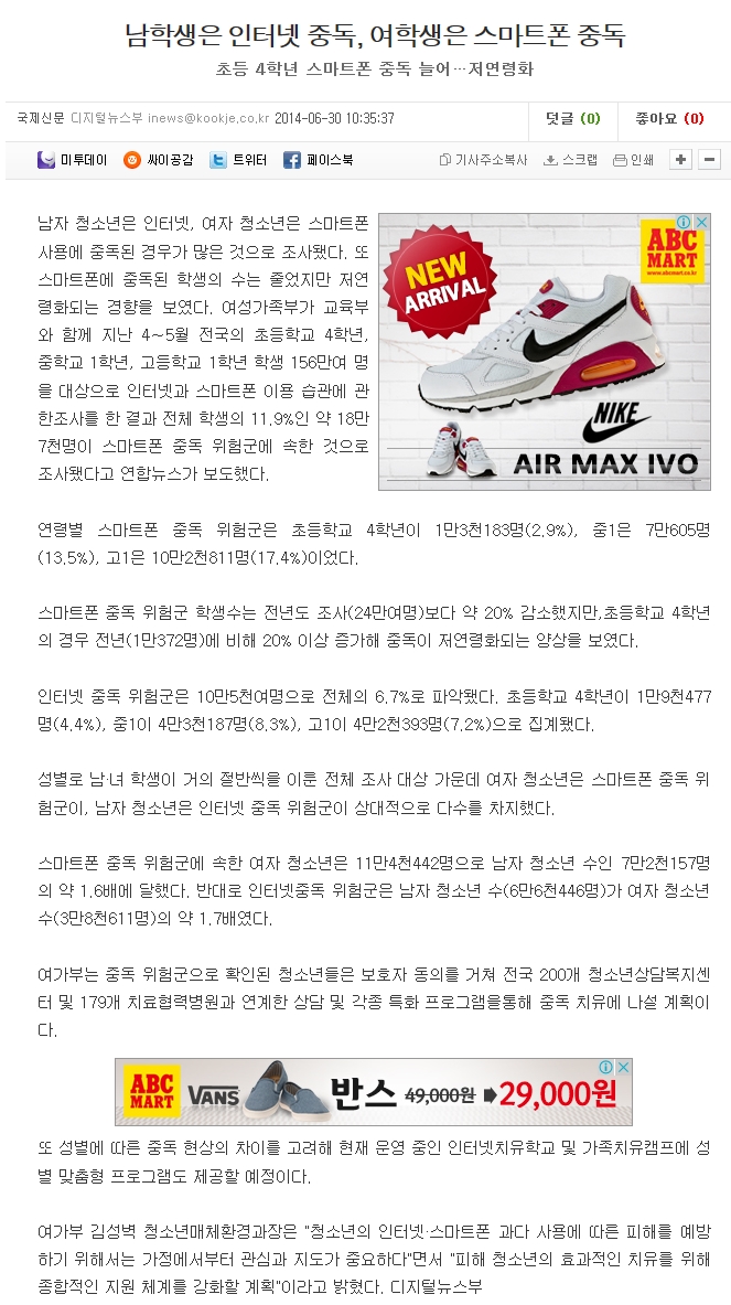 남자 청소년은 인터넷, 여자 청소년은 스마트폰사용에 중독된 경우가 많은 것으로 조사됐다. 또 스마트폰에 중독된 학생의 수는 줄었지만 저연령화되는 경향을 보였다. 여성가족부가 교육부와 함께 지난 4∼5월 전국의 초등학교 4학년, 중학교 1학년, 고등학교 1학년 학생 156만여 명을 대상으로 인터넷과 스마트폰 이용 습관에 관한조사를 한 결과 전체 학생의 11.9%인 약 18만7천명이 스마트폰 중독 위험군에 속한 것으로 조사됐다고 연합뉴스가 보도했다.