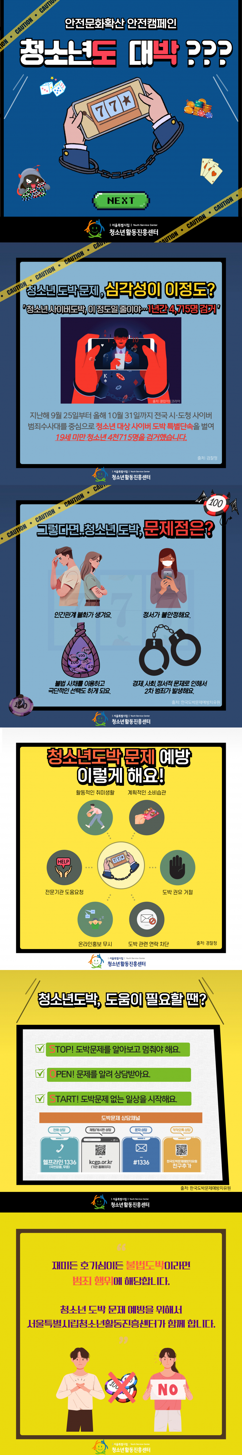 서울특별시립청소년활동진흥센터에서는 지역 내 안전 문화 확산을 위하여 청소년 도박 문제 예방을 주제로 안전 정보 제공을 하고 있습니다.